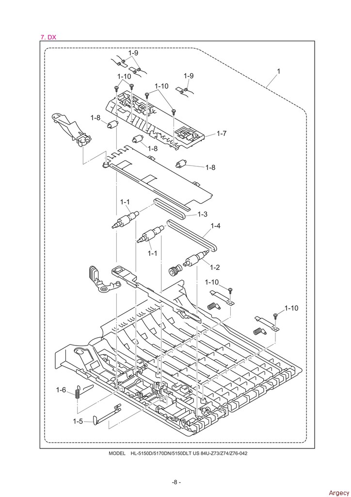 | 7. DX (HL-5150D / 5170DN ONLY) 1 LJ7661001 DX FEED ASSY 1- 1 LJ7663001 2 SIDE REGIST ROLLER ZL21- 2 LJ7664001 DX FEED ROLLER1- 3 LJ5015001 T-BELT (S) 1- 4 LJ5240001 T-BELT (L)1- 5 LJ5248001 GUIDE ACTUATOR1- 6 LJ7669001 GROUND WIRE 1- 7 LJ7670001 DX ROLLER HOLDER1- 8 LJ7671001 3 PRESSURE ROLLER1- 9 LJ7672001 3 PRESSURE ROLLER SPRING1- 10 085310816 6 TAPTITE, BIND B M3x8 |