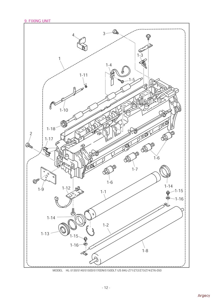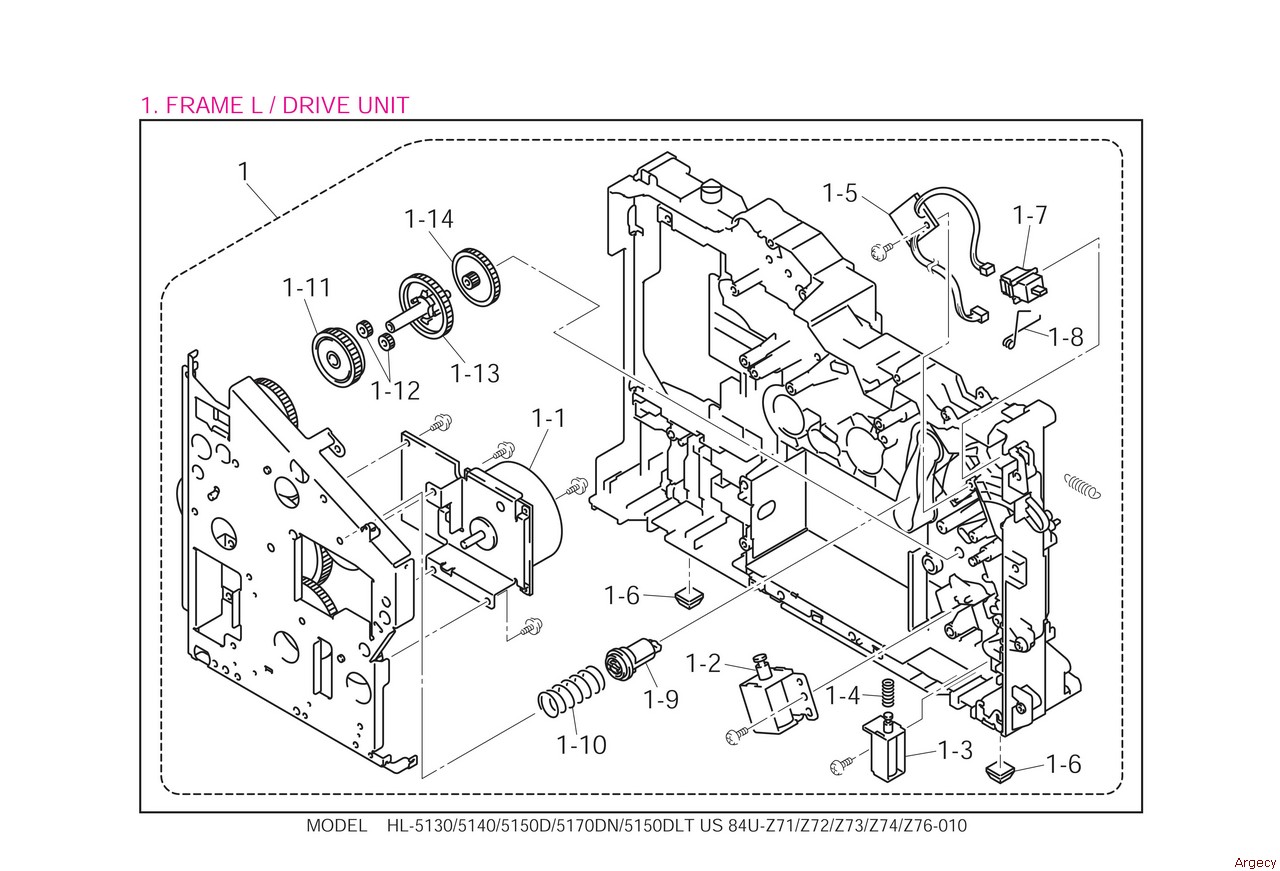 | 1. FRAME L / DRIVE UNIT MODEL HL-5130 / 5140 / 5150D / 5170DN / 5150DLT 1 LM2495001 MAIN FRAME L UNIT 30 E 1 LM2434001 MAIN FRAME L UNIT 40 E 1 LM2490001 MAIN FRAME L UNIT 50D E 1 LM2488001 MAIN FRAME L UNIT 70DN E1- 1 LM2440001 MAIN MOTOR ASSY ZL2E1- 2 3 4 LJ5014001 SOLENOID RELEASE SPRING P / R 1- 5 LJ9166001 TONER LED PCB UNIT ASSY ZL 6 LJ7403001 2 RUBBER FOOT1- 7 LG3218001 DOCUMENT COVER SENSOR 1- 8 LJ7784001 SENSOR CLIP1- 9 LJ7377001 DEVELOP JOINT 1- 10 LJ7376001 JOINT SPRING 1- 11 UH3044000 GEAR, 40 / 54Y 1- 12 UL6569000 2 GEAR 13 UL8977001 GEAR 45 ARM F / R 1- 14 LM2444001 GEAR 20 CENTER F / R |
