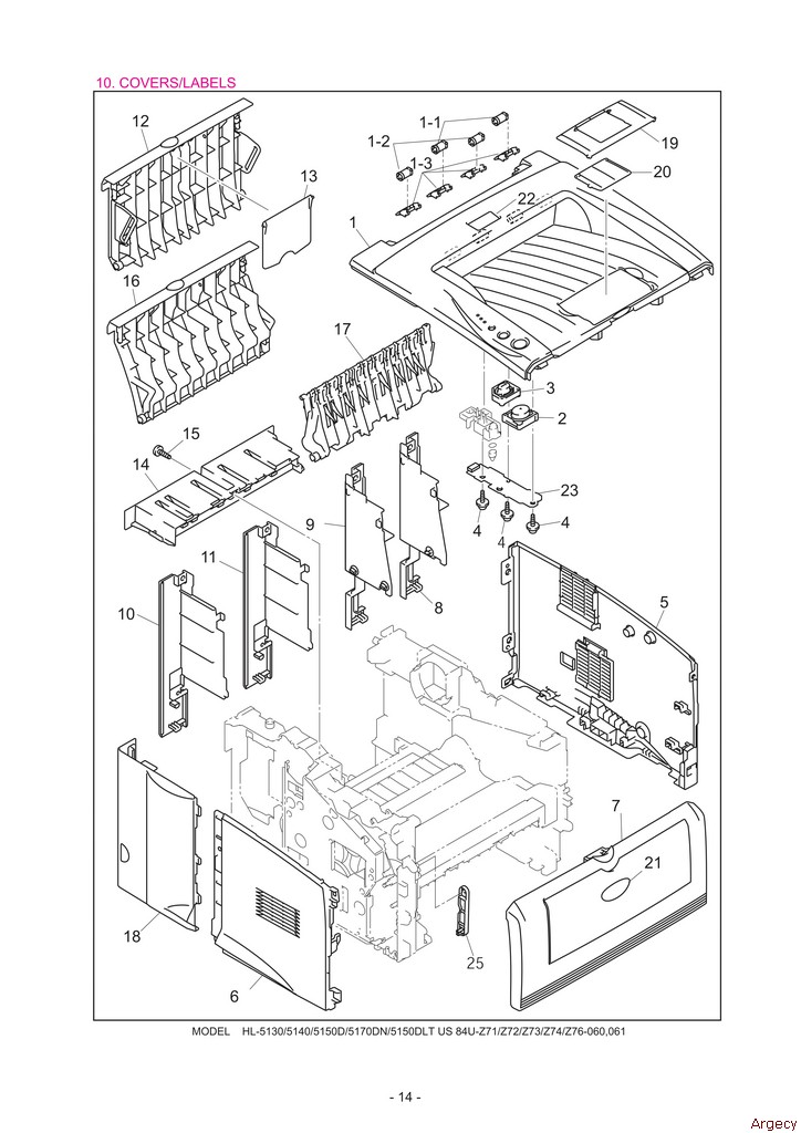 | 10. COVERS / LABELS 1 LM2273001 TOP COVER ASSY ZL2E 1 LJ7911001 2 CORRUGATION PINCH ROLLER R 1- 2 LJ7912001 2 CORRUGATION PINCH ROLLER L 1- 3 UL9123001 4 PINCH ROLLER HOLDER 2 LJ7451001 SW KEY A 3 LJ7452001 SW KEY B 4 087310815 3 TAPTITE, CUP B M3X8 chg 5 LM2713001 SIDE COVER R ASSY chg 6 LM2714001 SIDE COVER L ASSY chg 7 LM2724001 FRONT COVER ASSY ZL2E (HL-5130 / 5140) 8 LJ7465001 REAR COVER R 8 LM2760001 REAR COVER R MOF (With MIN FIN logo) add 9 LJ7617001 REAR COVER R MP 10 LJ7466001 REAR COVER L 11 LJ7618001 REAR COVER L MP 12 LJ7610001 REAR COVER MP 13 LJ7613001 REAR COVER MP TRAY 14 LJ7467001 REAR COVER C 15 085411216 TAPTITE, BIND B M4X12 16 LJ7469001 OUTER CHUTE 17 LJ7699001 OUTER CHUTE DX ASSY 18 LM2715001 ACCESS COVER ASSY chg 19 LJ7895001 SUPPORT FLAP 20 LJ7896001 SUPPORT FLAP S 21 LJ7350001 BROTHER EMBLEM 22 LM2507001 MODEL PLATE 513022 LM2504001 MODEL PLATE 514022 LM2505001 MODEL PLATE 5150D 22 LM2506001 MODEL PLATE 5170DN 23 LJ9180001 PANEL PCB ASSY B 51216524 LJ0908001 LASER CAUTION LABEL B 25 LJ7468001 LINK (HL-5130 / 5140) |