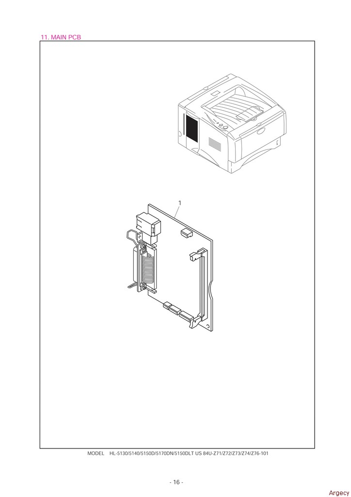 | 11. MAIN PCB 1 LJ9901001 MAIN PCB ASSY 5130 FLASH B512208 CHG 1 LJ9902001 MAIN PCB ASSY 5140 FLASH B512208 CHG 1 LJ9903001 MAIN PCB ASSY 5150D FLASH B512208 CHG 1 LJ9567001 MAIN PCB ASSY 5170DN FLASH B512185 1 LJ9904001 MAIN PCB ASSY 5150D KOR FLASH (For HL-5150D KOR) |