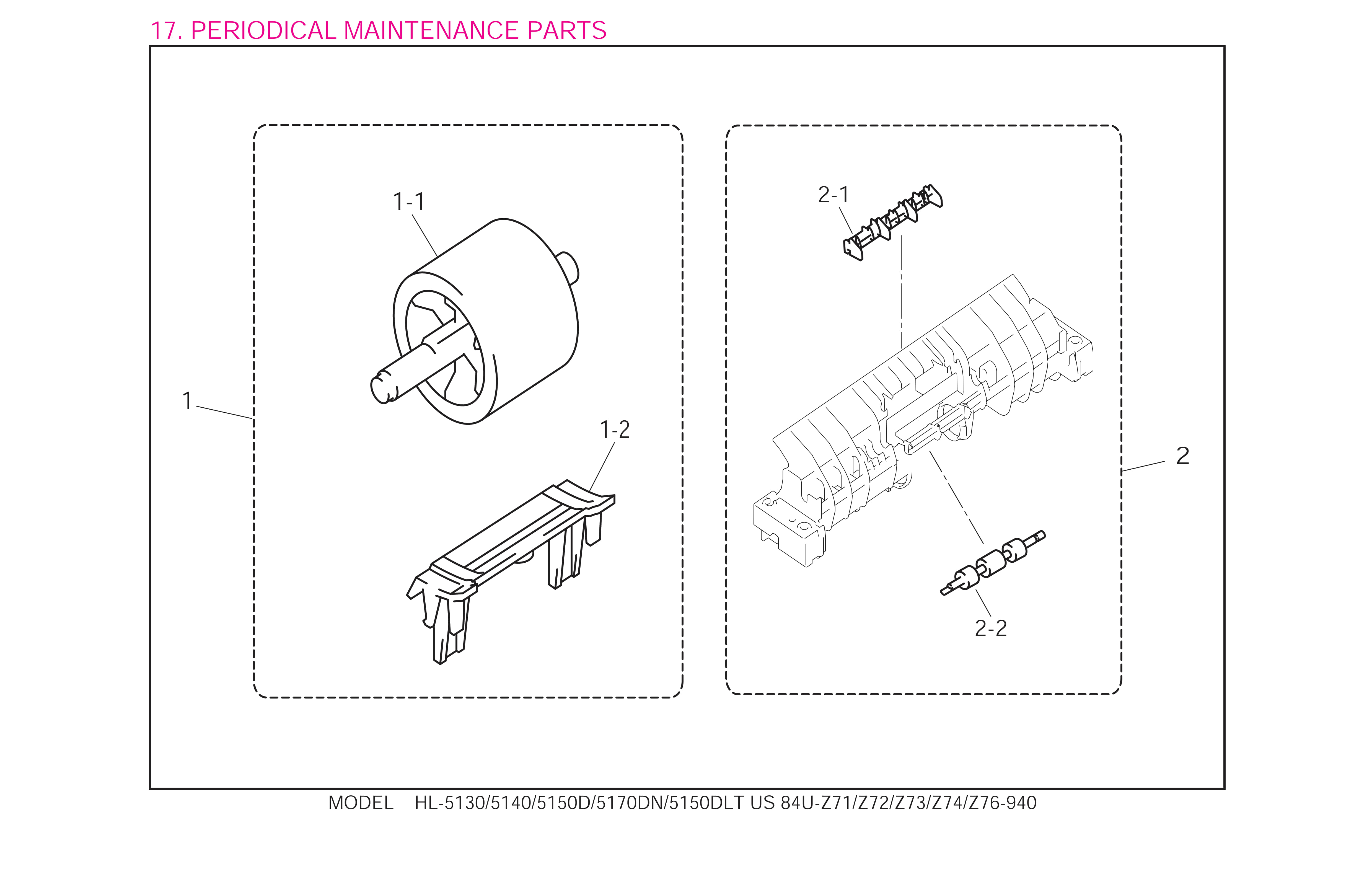| 17. PERIODICAL MAINTENANCE PARTS 1 LJ7920001 1 PAPER FEEDING KIT 1-1 LJ7703001 1 PAPER PICK-UP ROLLER ASSY ZL2*1 1-2 LJ7307001 1 PAD HOLDER ZL2 *2 2 LM2953001 1 ROLLER 6 GUIDE/ ROLLER (SP) 2-1 1 ROLLER 6 GUIDE 2-2 1 FIRST FEED ROLLER ASSY ZL2 |