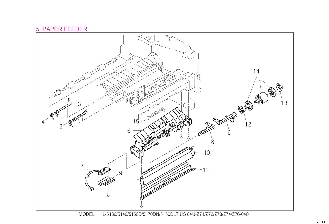 | 5. PAPER FEEDER 1 LJ7322001 REGIST FRONT ACTUATOR 2 LM2590001 REGIST FRONT ACTUATOR SPRING 3 LJ7324001 REGIST REAR ACTUATOR 4 LJ7325001 REGIST REAR ACTUATOR SPRING 5 6 LM2601001 PE ACTUATOR ZL2 (HL-5140 / 5150D / 5170DN) 7 LJ9235001 CASSETTE SENSOR PCB ASSY ZL2 (HL-5140 / 5150D / 5170DN) 8 LJ5155001 CA ACTUATOR (HL-5140 / 5150D / 5170DN) 9 LJ5211001 PE SENSOR COVER (HL-5140 / 5150D / 5170DN) 10 LM2033001 FRONT CHUTE GUIDE ASSY ZL2 11 LM2032001 FRONT TRAY CHUTE ASSY ZL2 12 LJ5020001 BUSH L 13 LJ5021001 BUSH R 14 LJ7730001 2 ROLLER COLLAR ZL2 15 16 LJ7342001 FRONT CHUTE (HL-5130 / 5140) ADD 16 LM2558001 FRONT CHUTE (HL-5150D / 5170DN / 5150DLT) |