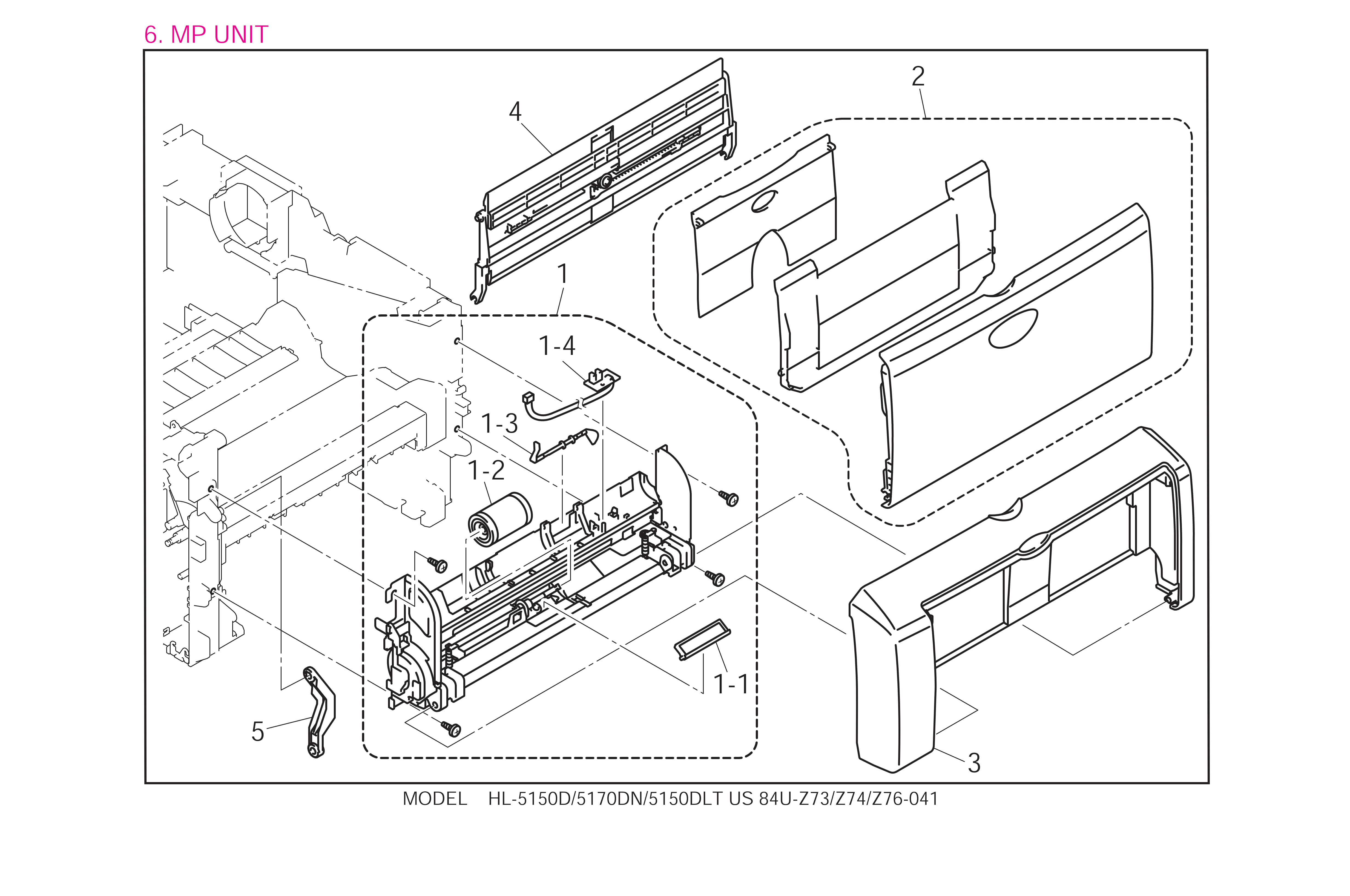 | 6. MP UNIT (HL-5150D / 5170DN ONLY) 1 LJ7551001 MP UNIT ASSY 1 LJ7555001 SEPARATION PLATE ASSY 2 LM2050001 PAPER PICK-UP ROLLER ASSY (SP) 3 LJ7571001 MP-PE ACTUATOR 1- 4 LJ9222001 MP-PE SENSOR PCB ASSY ZL 2 B512107 2 LJ7587001 MP TRAY ASSY 3 LM2313001 MP FRONT COVER ASSY ZL2E 4 LJ7589001 MP PAPER GUIDE ASSY 5 LJ7600001 DRIVE RELEASE LINK MP (HL-5150D / 5170DN) |