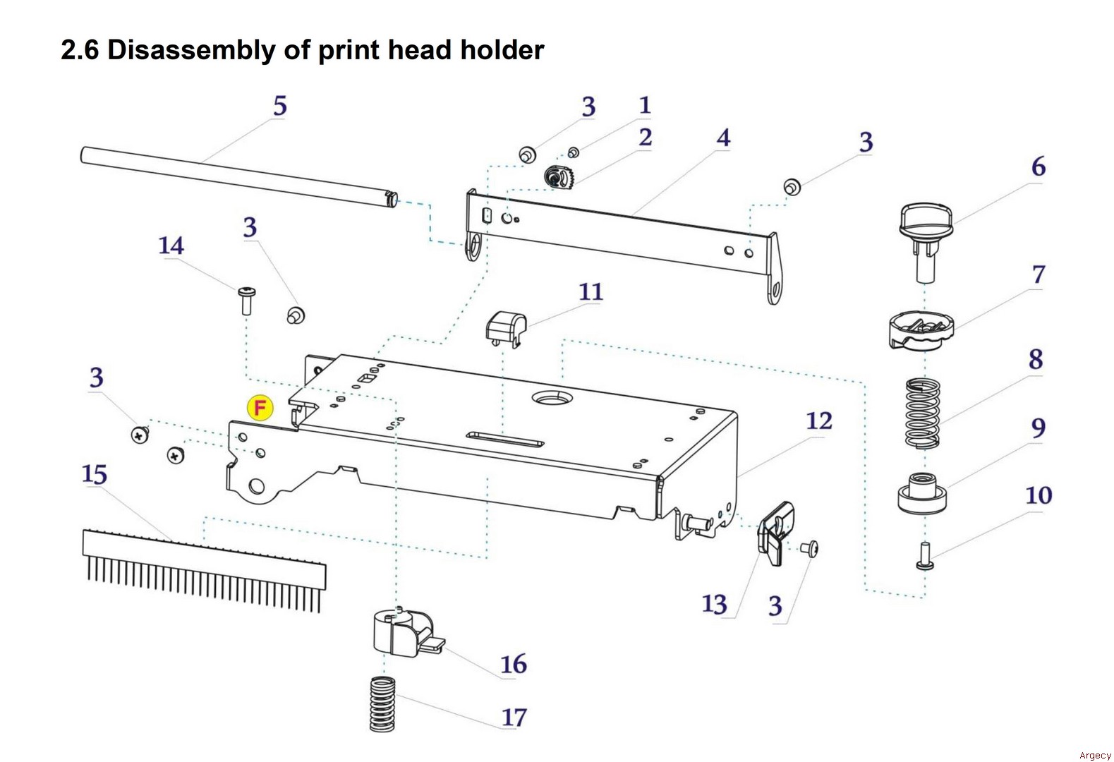 | 2.6 1 21.E.00820-030r Screw M2*3 2 21.503.491.0420r Balancing Knob 3 21.E.00530-040f Screw 3*4 6 4 21.501.491.0030r Guides Axle Holder 5 21.508.491.0010r Ribbon Guides 2 6 21.503.491.0390r Print Head Adjustment Knob 7 21.503.491.0430r Print Head Adjustment Plate 8 21.501.491.0280r Print Head Spring 9 21.503.491.0141r Print Head Spring 10 21.E.11230-100r Screw M3.0*10 11 21.503.491.0230r Print Head Keycap 12 21.501.491.0010r Print Head Holder 13 21.503.491.0131r Guides Upper Block 14 21.E.12830-080r Screw 3*8 15 21.501.491.0380r Esd Brush 16 21.503.491.0400r Print Head Spring 1721.501.491.0252r Print Head Spring Left | ![]() |