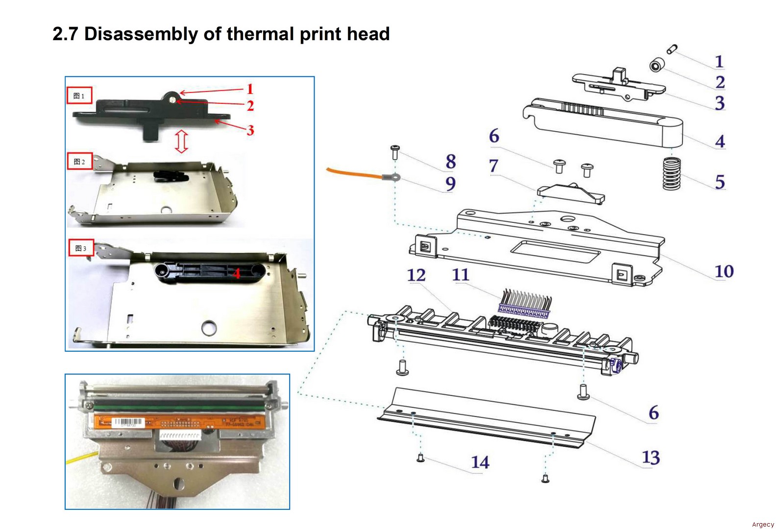| 2.7 1 21.508.491.0090r Wheel Axis 2 21.503.491.0370r Print Head Adjustment Wheel 3 21.503.491.0150r Print Head Key 4 21.503.491.0381r Print Head Balancing Pole 5 21.501.491.0242r Print Head Spring Right 6 21.E.00130-060r Screw M3*6 7 21.503.491.0440r Print Head Adjustment Block 8 21.E.00530-040f Screw M3*4 9 21.001.904.0100r Grounding Cable Assy 10 21.501.491.0050r Print Head Fixing Plate 11 21.001.491.0041r Print Head Cable 12 21.916.491.0010r Thermal Print Head Assy 13 21.501.491.0060r Print Head Cover 14 21.E.00820-030r Screw M2.0*3 | ![]() |