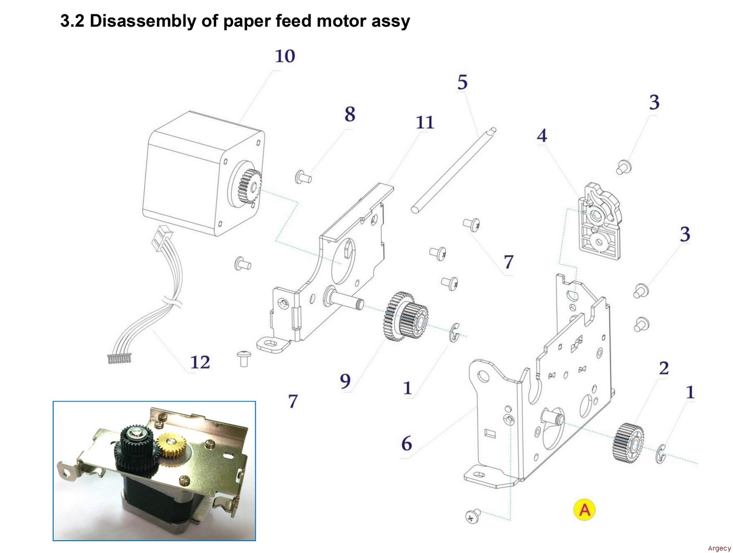 | 3.2 1 21.E.60340-000r E Ring 4.0 2 21.503.491.0360r Gear 33 3 21.E.00530-040f Screw M3*4 4 21.503.491.0260r Cover-Open Block 5 21.508.491.0030r Rotation Axis 6 21.501.491.0140r Paper Guides Holder, Left 7 21.E.01030-070r Screw M3*7 8 21.E.00530-040f Screw M3*4 9 21.503.491.0330r Gear 29-36 10 21.007.491.0010r Paper Feed Motor Assy 11 21.501.491.0150r Motor Holder 12 21.001.491.0090r Motor Cable | ![]() |
