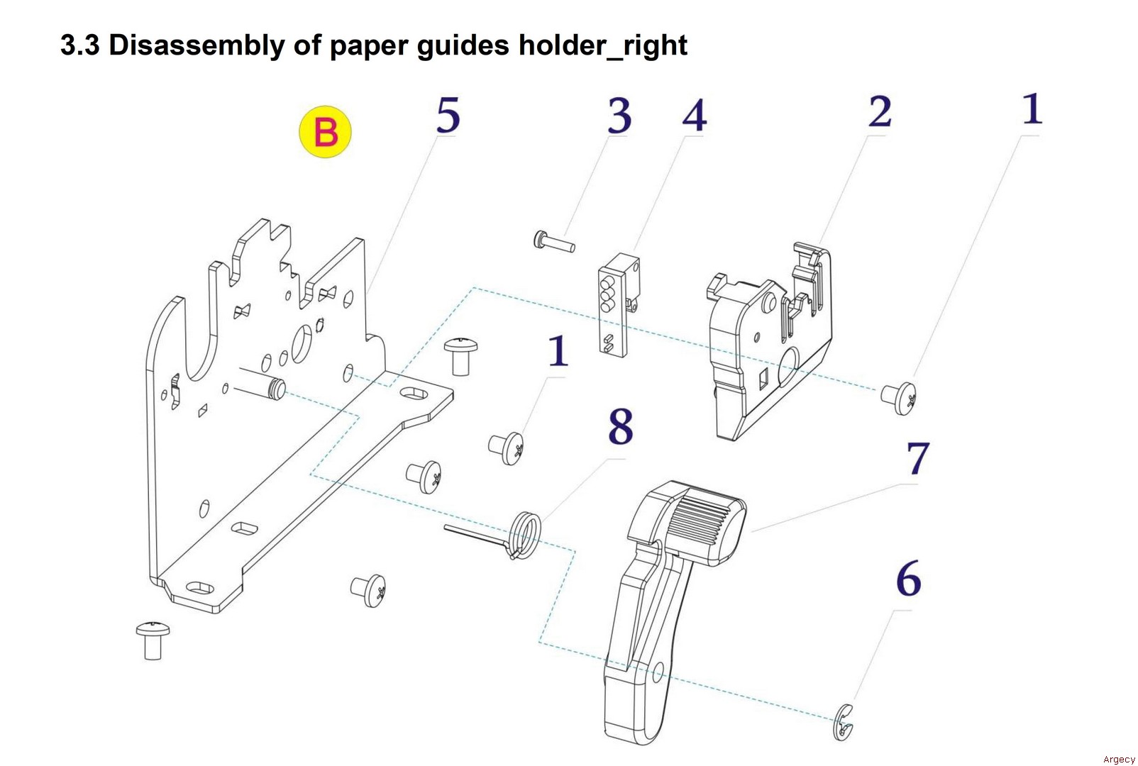 | 3.3 1 21.E.00130-060r Screw M3*6 221.503.491.0170r Guides Lower Block 3 21.E.12816-065r Screw M1.6*6.5 4 21.902.491.0021r Cover Open Sensor Assy 5 21.501.491.0160r Right Paper Guides Holder 6 21.E.60330-000r E Ring 3.0 7 21.503.491.0060r Locking Hook 8 21.501.491.0330r Locking Hook Spring | ![]() |