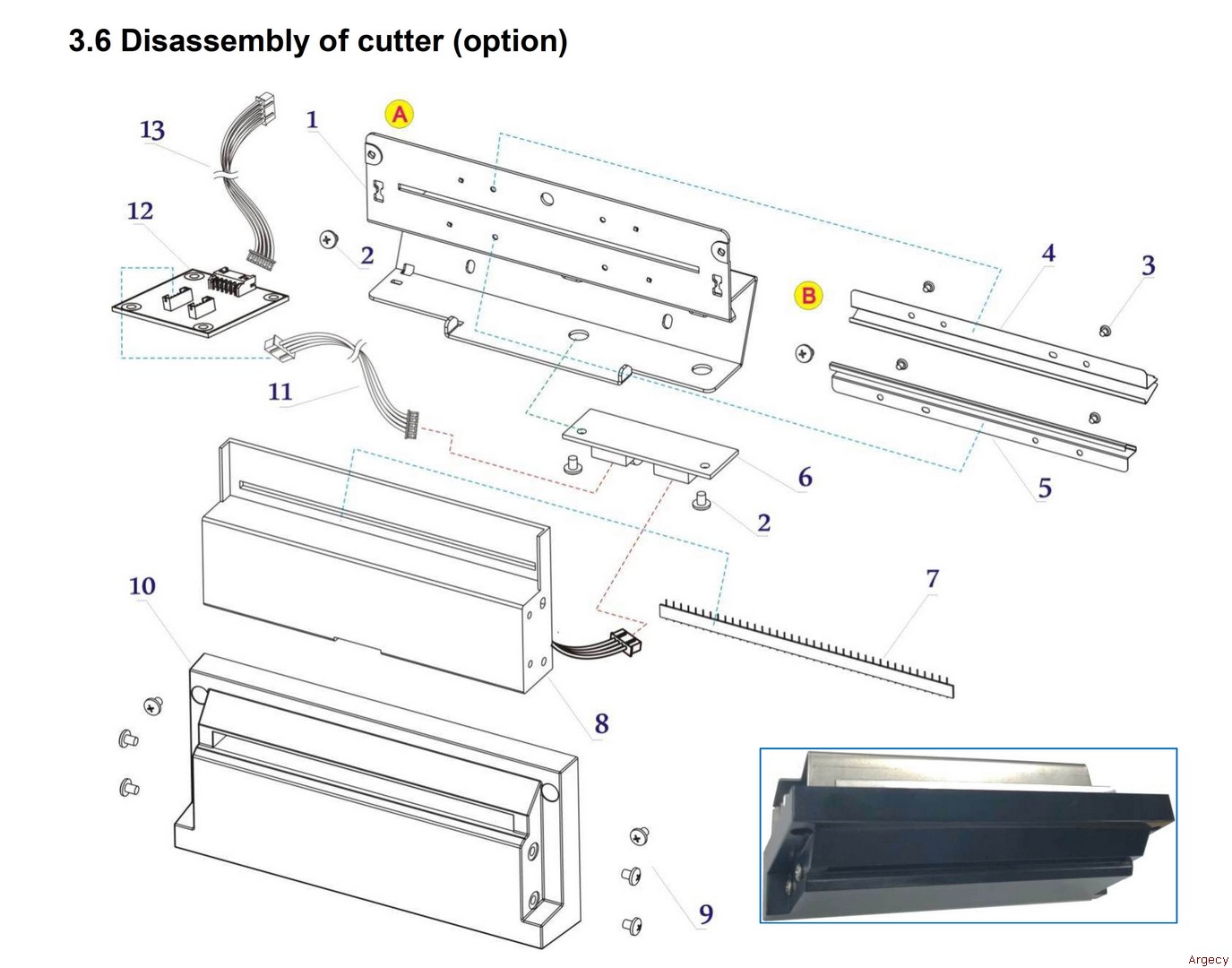 | 3.6 1 21.501.491.0220r Cutter Holder 1 2 21.E.11630-060r Screw M3.0*6 4 3 21.E.01720-020r Screw M2*2 4 4 21.501.491.0200r Upper Paper Guides 1 5 21.501.491.0210r Lower Paper Guides 1 6 21.903.491.0030r Cutter Drive Assy 1 7 21.501.491.0390r Cutter Esd Brush 8 21.903.904.0010r Cutter 9 21.E.00530-040f Screw M3 ?4 10 10 21.503.491.0451r Cutter Cover 11 21.001.491.0110r Connection Cable 12 21.906.491.0040r External Extension Board Assy 13 21.901.151.0030r External Extension Cable | ![]() |