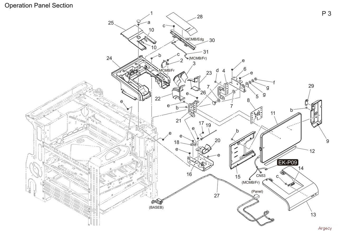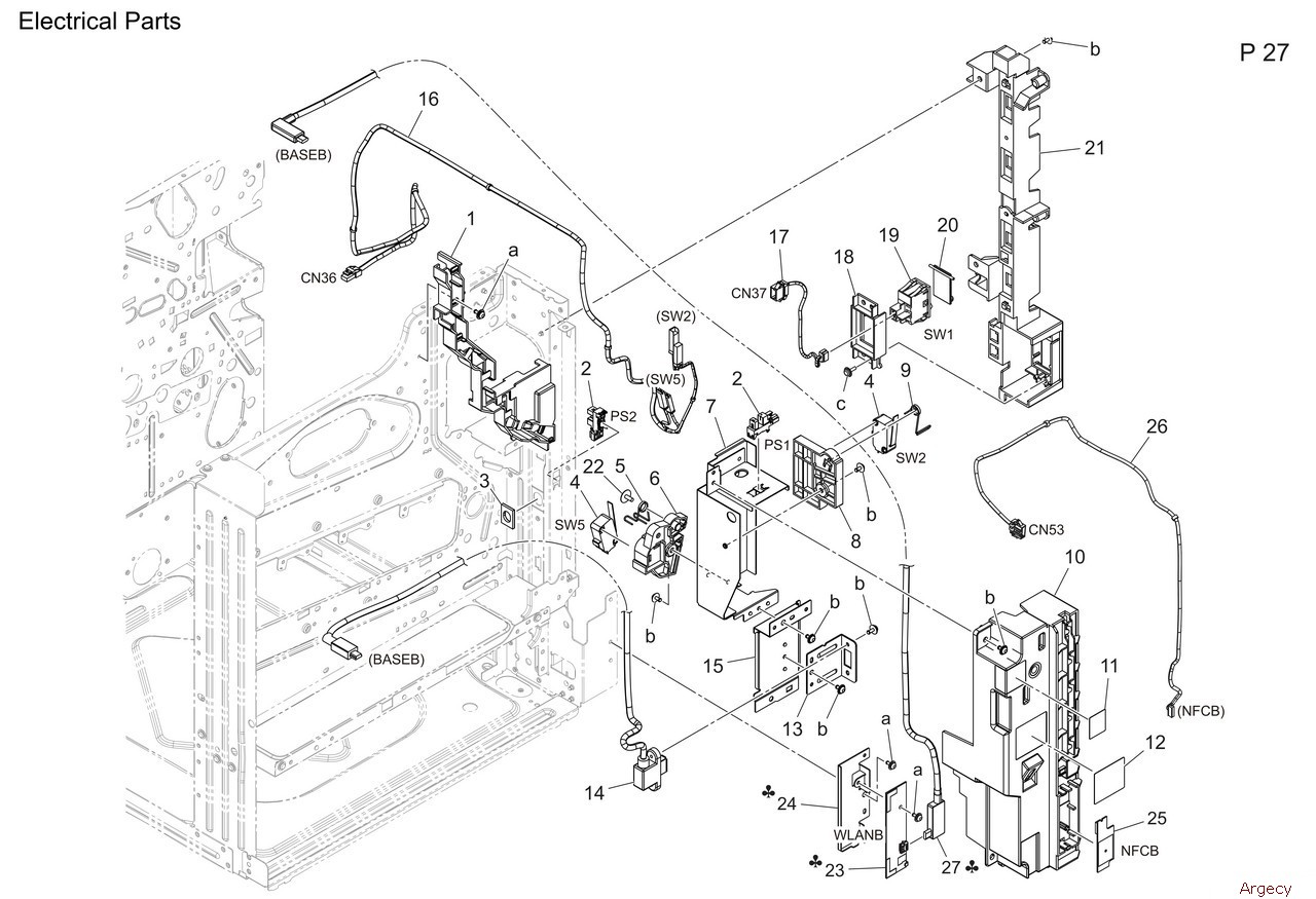 1 A93E135000 Wiring Guide 2 A5C1M50100 Photointerrupter 3 A93E105100 Seal 4 9J06M60100 Micro Switch 5 A93E135211 Torsion Coil spring 6 A93E136911 Holder 7 A93E134300 Mounting Plate 8 A93E135401 Holder 9 A161151300 Torsion Coil spring 10 A93E134801 Cover 11 A93E402601 Label K 12 ACT9401200 Label 13 A93E135900 Mounting Plate 14 A93EN12000 IF Cable 15 A93E134400 Mounting Plate 16 A93EN10201 Interlock Wiring 17 A93EN10G00 Relay harness 1 18 A93E132001 Mounting Plate 19 A93EM60000 Rocker switch 20 A93E132200 Cover 21 A93E132103 Cover 22 4163529301 SCREW 23 AA2JM72F01 Interface Board 24 A93E134700 Mounting Plate 25 AA2JM70600 Interface Unit 26 A93EN12500 Wiring 27 A93EN12111 IF Cable |