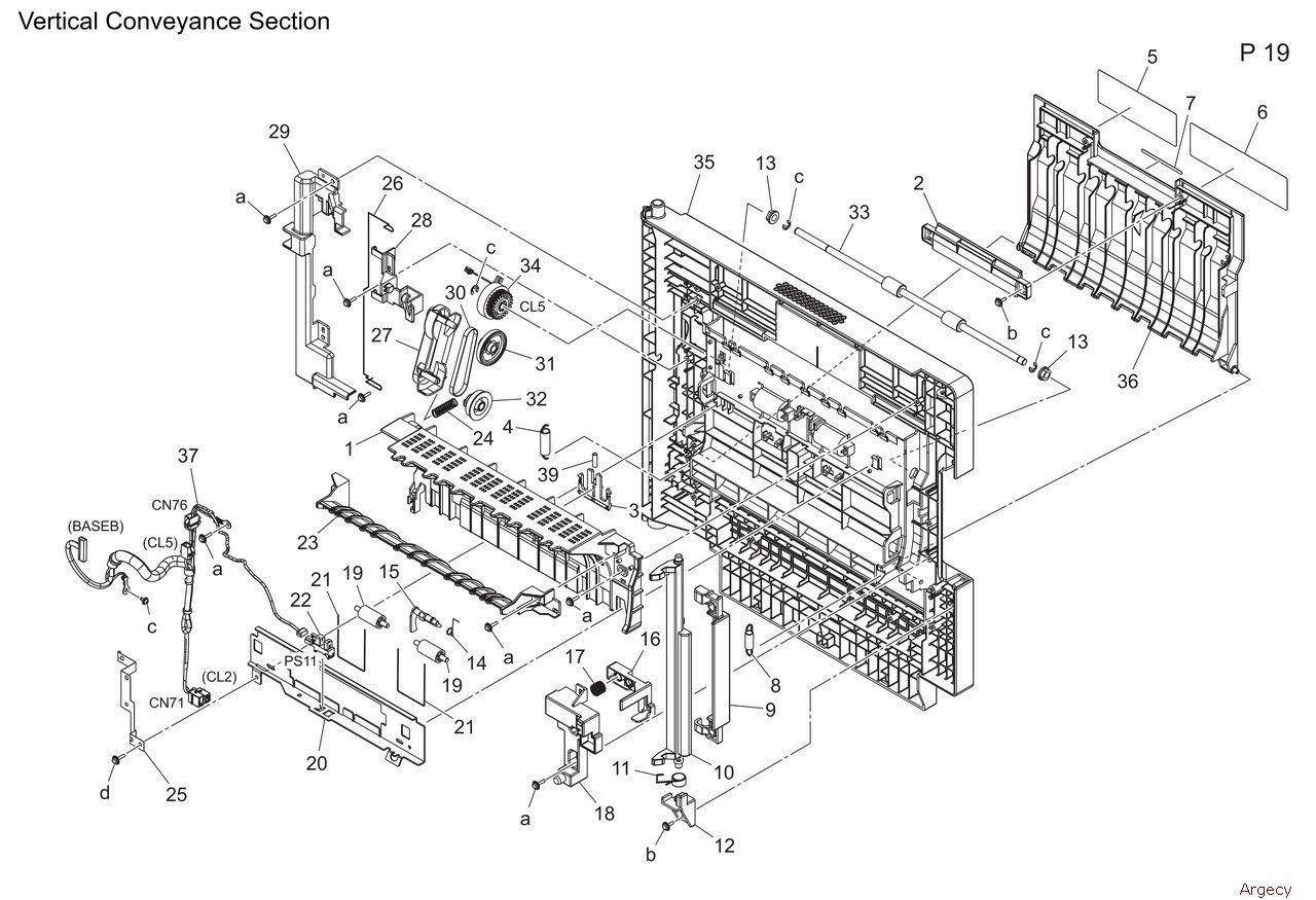 1 ACT9813100 Guide Upper 2 A93E810800 Handle 3 A93E810701 Lock Part 4 A93E810600 Pulling Coil spring 5 A93E944500 Label 6 A93E944600 Operation Label 7 A93E942100 Label 8 A0VD703700 Pulling Coil spring 9 A93E814702 Handle 10 A93E814300 Lock Lever 11 A93E814500 Torsion Coil spring 12 A93E814401 Holder 13 1134304301 BUSHING 14 A93E815200 Torsion Coil spring 15 A93E815100 Actuator 16 A93E814001 Lever 17 A93E811400 Compressing Coil spring 18 A93E814100 Cover 19 4538373201 ROLL 20 A93E810211 Reinforce Plate 21 A93E812100 Spring 22 A5C1M50100 Photointerrupter 23 A93E814202 Guide 24 A93E813800 Compressing Coil spring 25 A93E814800 Ground Plate 26 A93E594200 Ground Contact 27 A93E813302 Swing Housing 28 A93E813201 Positioning Shaft 29 A93E815302 Cover 30 A0HR211900 Drive Belt 5 31 A93E813501 Gear 31T 32 A93E813700 Gear 23T 33 A93E812000 Roller 34 A7AHM20501 Clutch 35 A93E810118 Door 36 A93E810502 Openclose Guide 37 A93EN10B00 Conveyance Wiring 1 39 A93E810900 Compressing Coil spring |