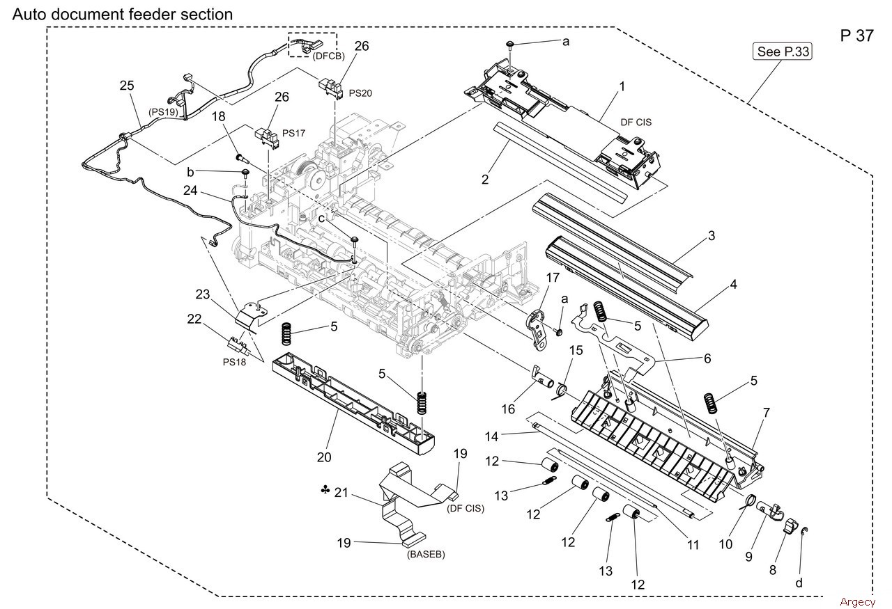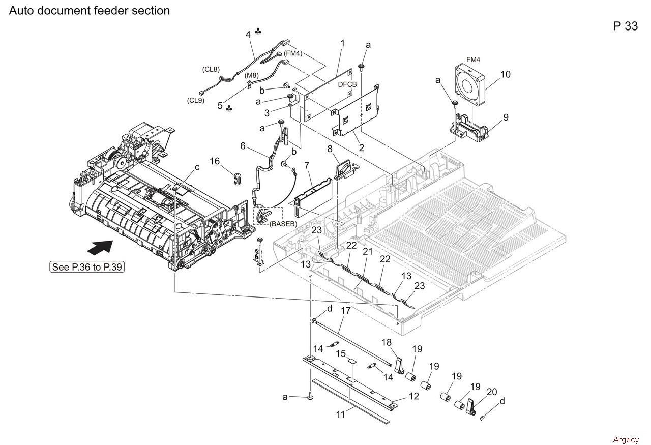 1 A93EH00901 ADF Control Board Assy 2 A93E267200 Mounting Plate 3 A93E277000 BKT EARTH BOARD 4 A93EN11700 Conveyance Harness 1 4 A93EN11K00 Conveyance Harness 2 5 A93EN11800 ADF Drive Harness 1 5 A93EN11M00 ADF Drive Harness 2 6 A93EN11900 ADF Control Harness 7 A93E267300 Wiring Guide 8 A93E270000 Holder 9 A93E265000 Holder 10 9J06M10000 Fan motor 11 A93E276100 Cushion 12 A93E267500 Reinforce Plate 13 A93E267900 Guide Film 2 14 A93E267000 Pulling Coil spring 15 A93E267400 Reflecting Pad 16 A3GNM93100 Ferrite core 17 A93E267100 Shaft 18 A93E267701 Lever Rear 19 A93E266900 Roll 20 A93E267601 Lever Front 21 A93E268100 Guide Film 4 22 A93E268000 Guide Film 3 23 A93E267800 Guide Film 1 |