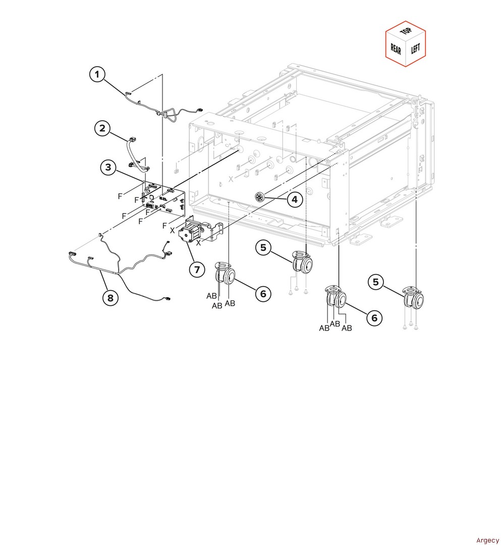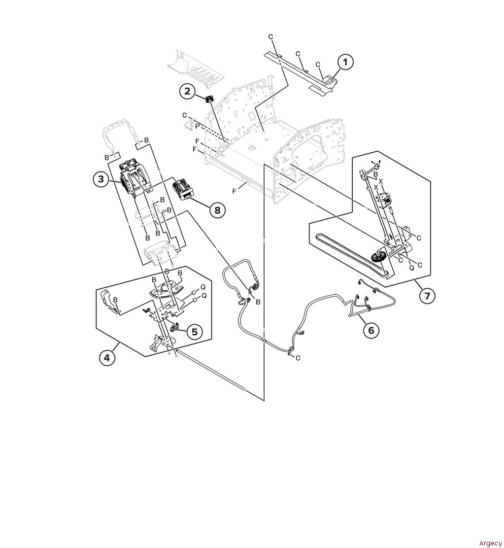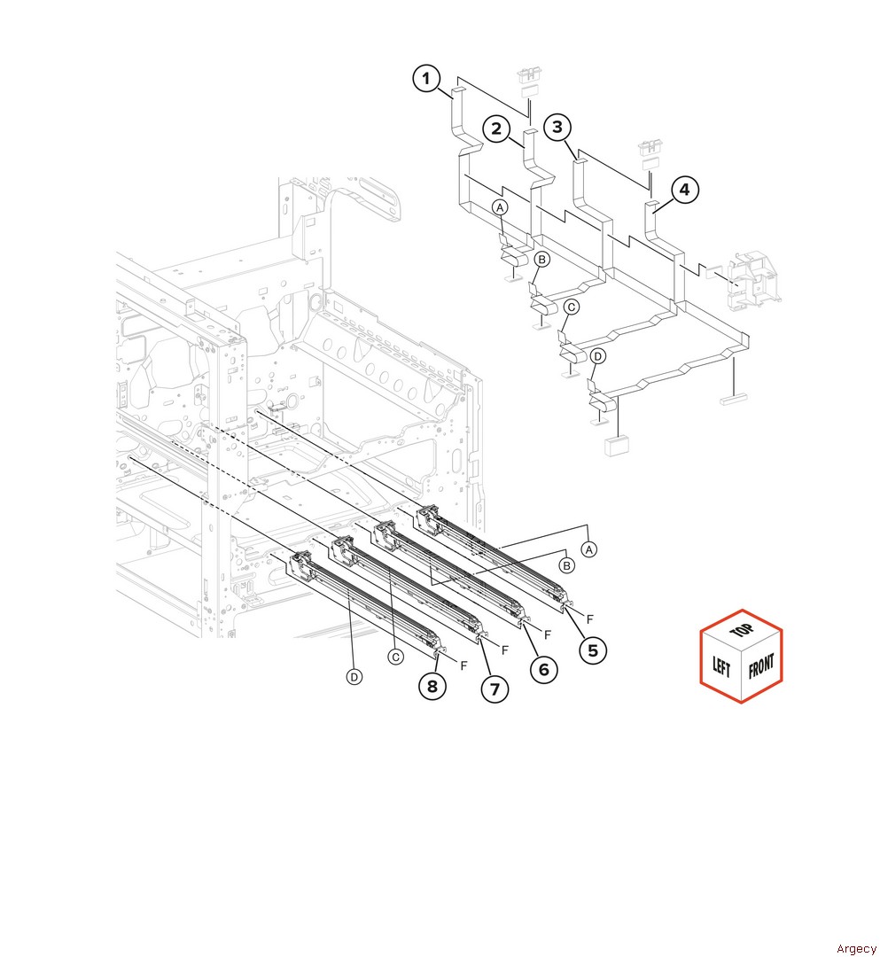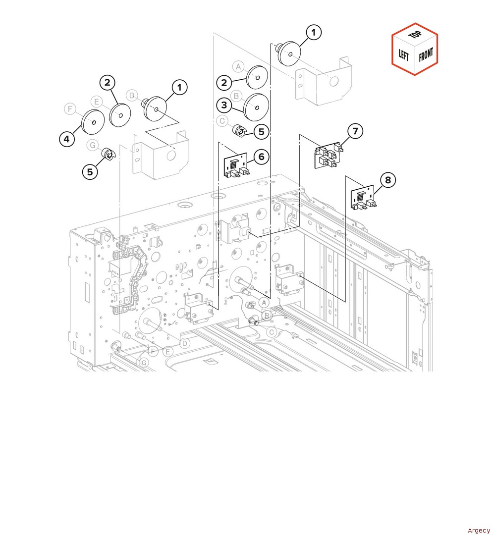 Assembly 62: 2000-sheet tray feed 2 1 40X0589 Sensor (2000-sheet tray feed) 2 3 40X0768 Sensor (2000-sheet tray pick position) 4 5 40X0913 Ball bearing (6mm) 6 7 8 | |