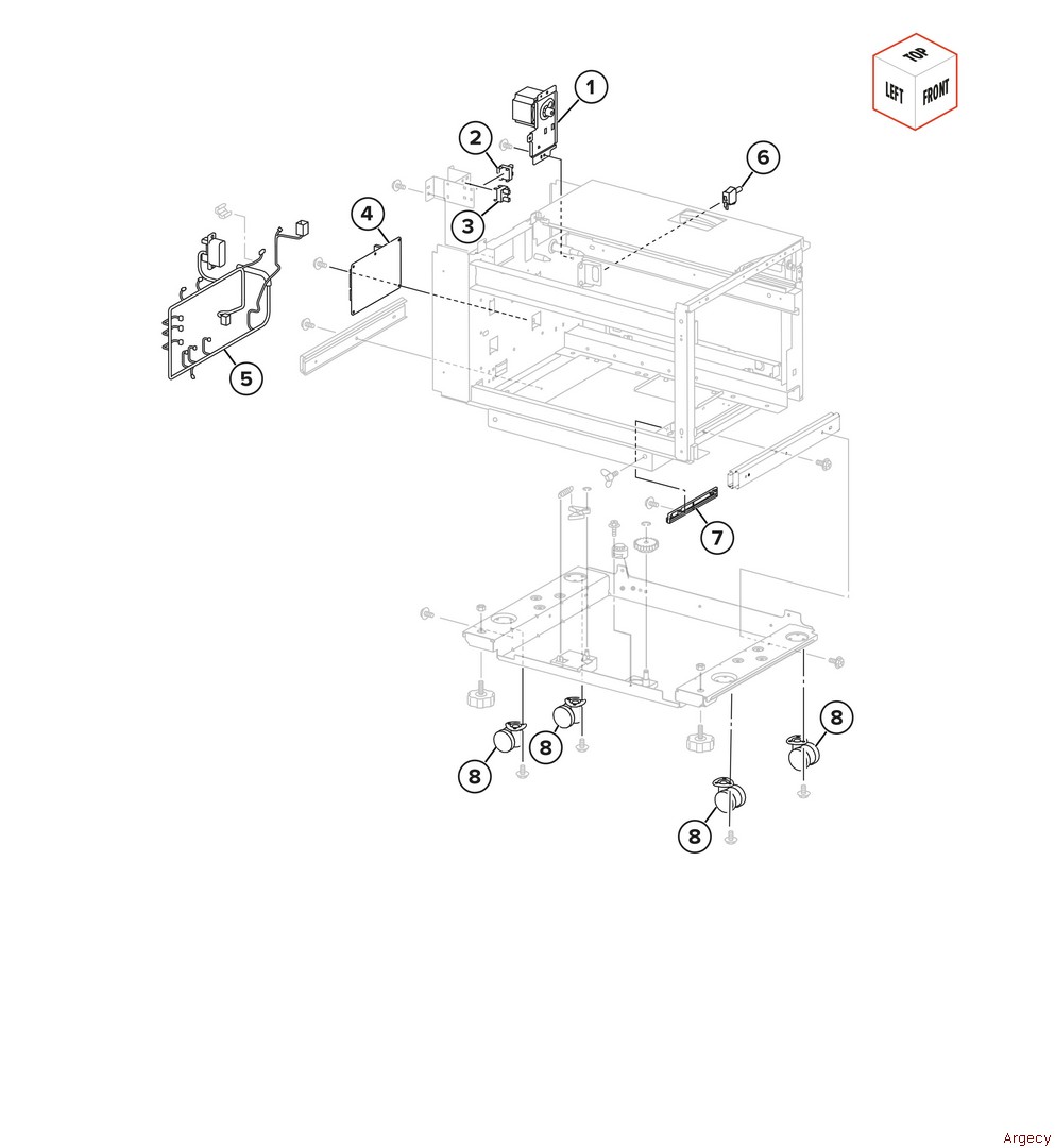 Assembly 85: 520-sheet tray with cabinet transport 2 1 2 3 4 40X6668 Transport gear (34T) 5 6 7 8 | |