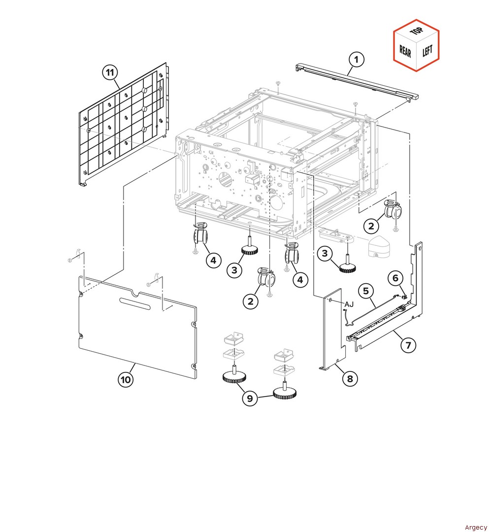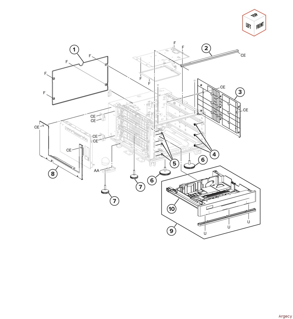 Assembly 80: 520-sheet tray with cabinet covers 1 1 2 3 4 40X6652 Tray guide left roller 5 40X6653 Tray guide right roller 6 7 8 9 | |