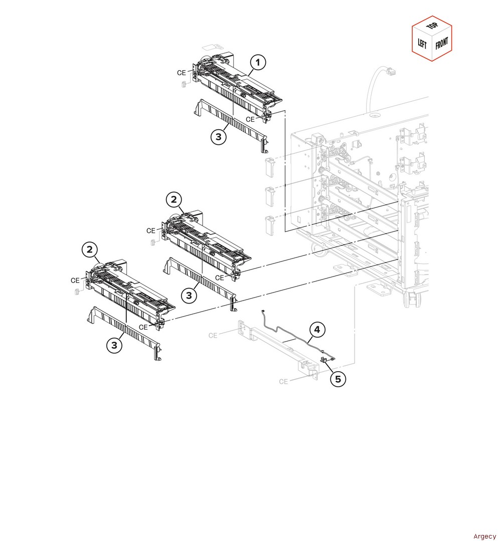 Assembly 68: 3 x 520-sheet tray feed 1 1 2 2 3 40X6699 Turn guide 4 5 40X6700 3 x 520-sheet tray door switch | |
