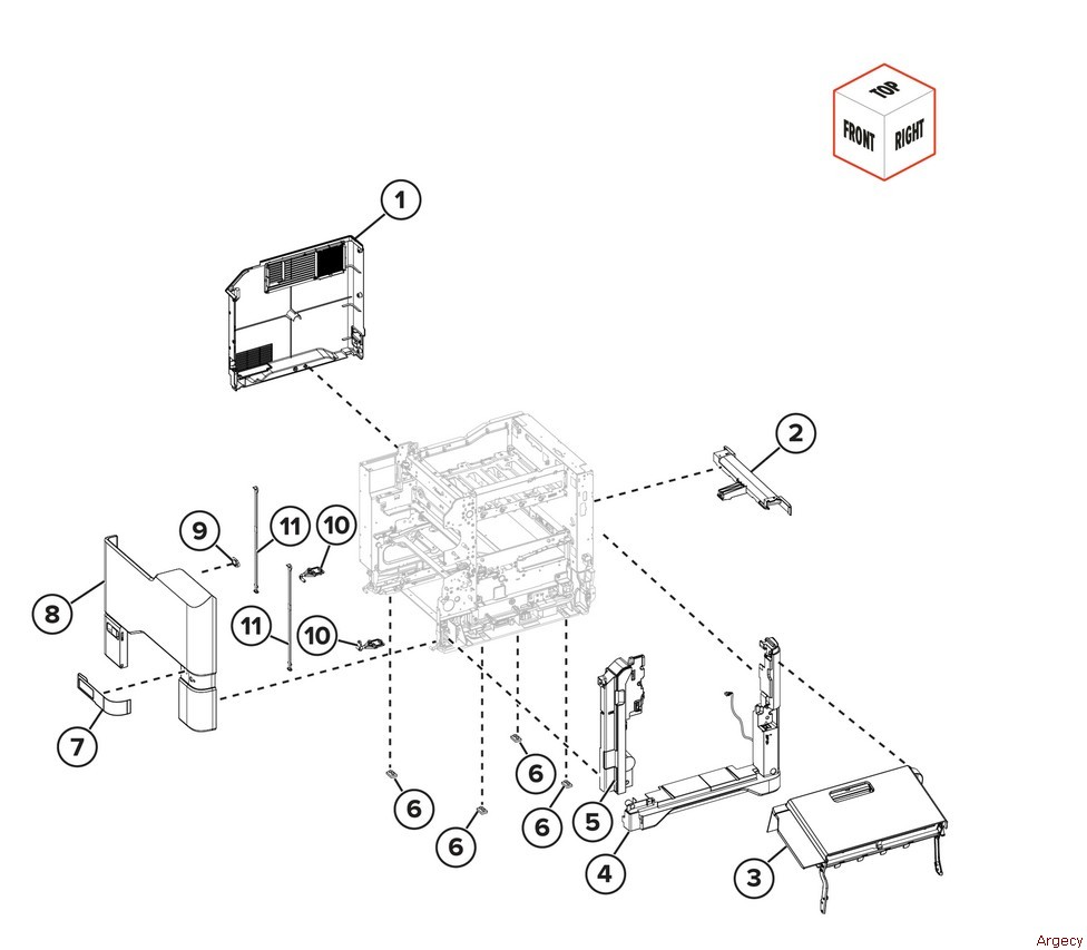 PL 28.10 Covers 1 1 — Left cover (REP 28.10) 2 — Rear handle cover 3 002N03775 Toner door assembly (REP 28.2) 4 5 — Motor cover (REP 28.7) 6 — Rubber feet 7 — Tray indicator 8 002N03776 Front door cover (REP 28.5) 9 10 11 Note: Includes left hinge-and right hinge |