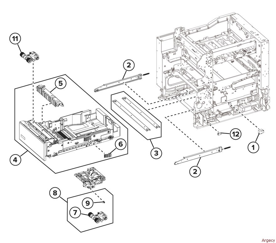 PL 70.10 Tray 1 Assembly 1 2 — Tray rails (REP 70.3) 3 — Support straps 4 5 — Separator bracket (P/O PL 70.10 Item 4) (P/O PL 70.10 Item 10) 6 7 — Pick roller (REP 70.4) (P/O PL 70.10 Item 8) (P/O PL 70.10 Item 10) 8 9 10 11 12 Note: HFSI. To reset HFSI counter, refer to dC135 |