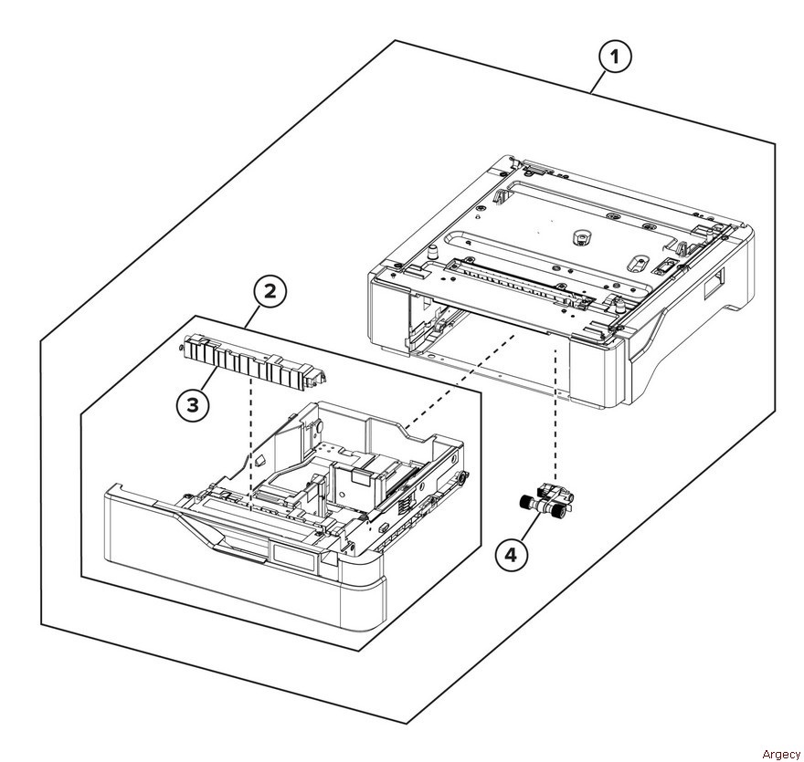 PL 70.15 Optional 550-Sheet Tray 1 — Optional 550 sheet tray 2 3 — Separation Block (P/O PL 70.15 Item 2) (P/O PL 70.15 Item 5) 4 — Pick roller (REP 70.4) (P/O PL 70.15 Item 1) (P/O PL 70.15 Item 5) 5 Note: HFSI. To reset HFSI counter, refer to dC135 |