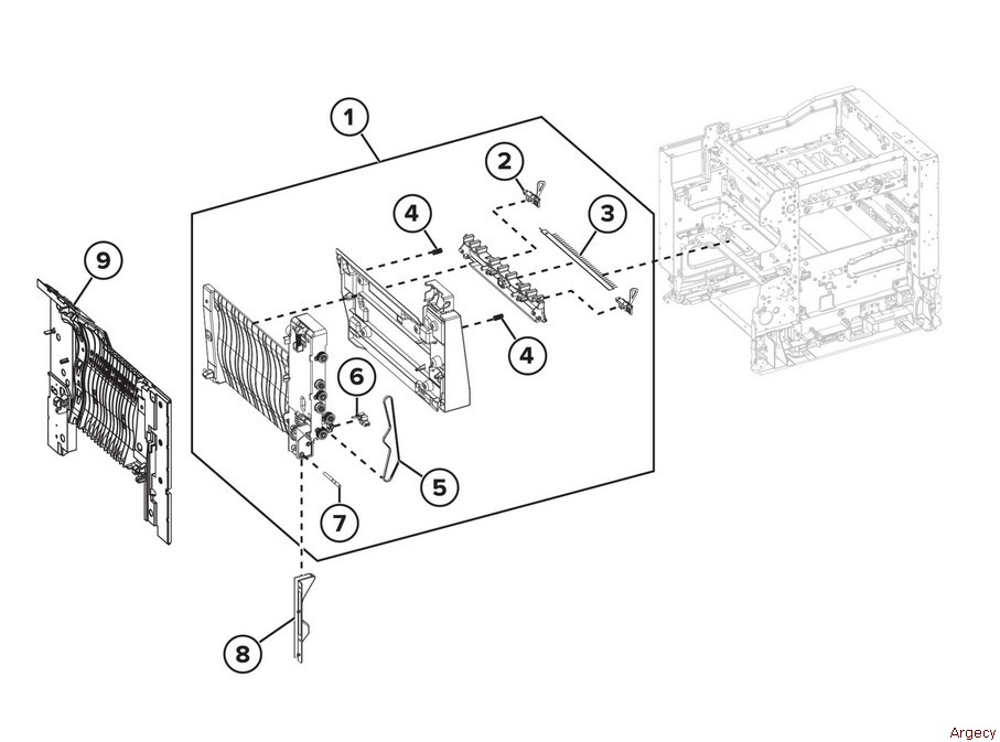 PL 32.05 Left Side Harness 1 2 — LVPS harness (P/O PL 32.05 Item 1) 3 — AC line in harness (P/O PL 32.05 Item 1) (REP 1.5) 4 — CMY motor harness (P/O PL 32.05 Item 1) 5 — Fuser AC harness (P/O PL 32.05 Item 1) (REP 10.3) 6 — BOR motor harness (P/O PL 32.05 Item 1) 7 — Fuser DC harness (P/O PL 32.05 Item 1) 8 — K Motor harness (P/O PL 32.05 Item 1) 9 — Exit/redrive motor harness (P/O PL 32.05 Item 1) |